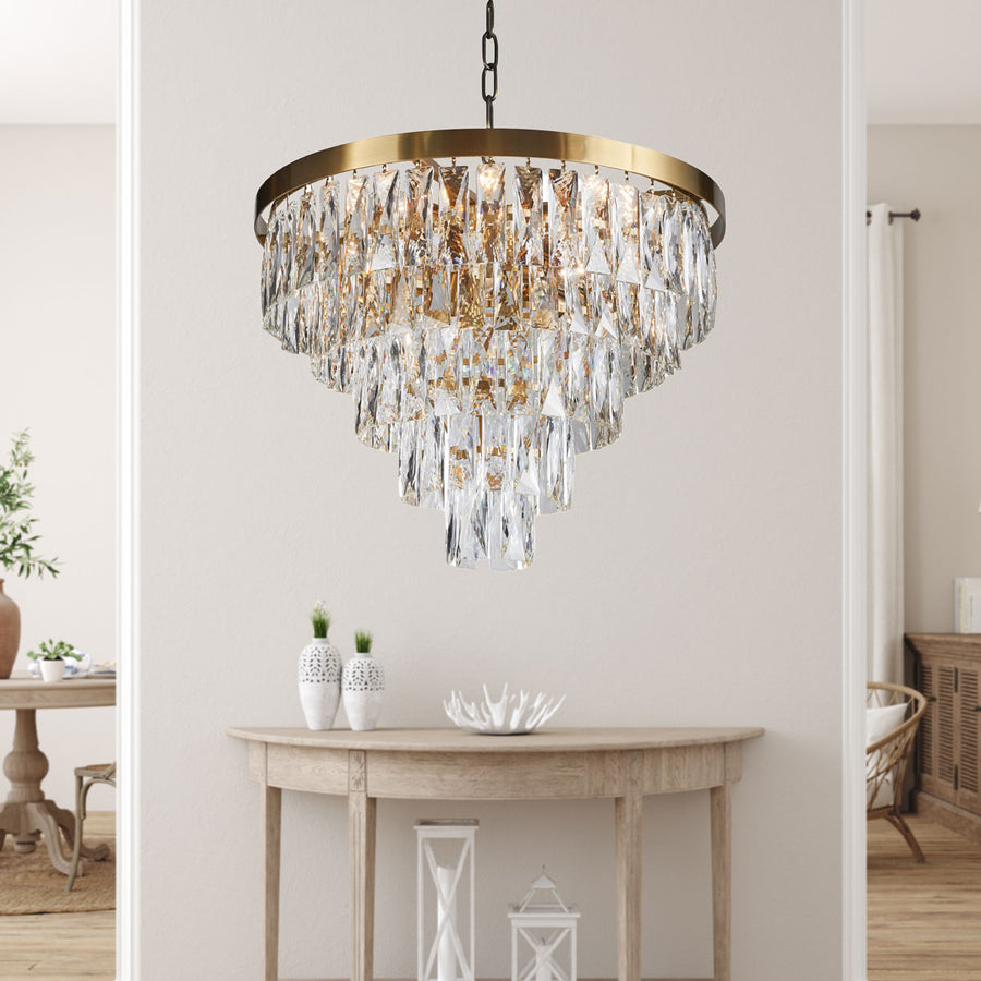 This exquisite chandelier is in a gold finish. The frame is made out of metal in a round shape. It comes with five tiers of hanging crystal accents in clear color, adding even more modern. You can create a timeless feel while using modern forms.